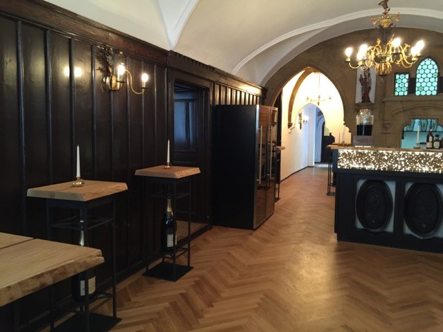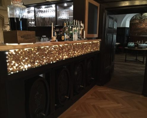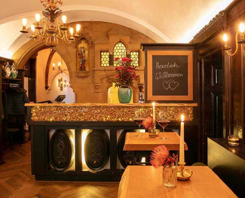Leger, handgefertigte Hochtische, und ein Touch Bordeaux verleihen der Schwemme Gemütlichkeit – ideal für den Empfang Ihrer Gäste.
